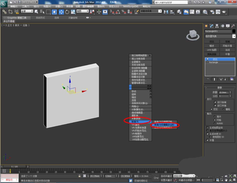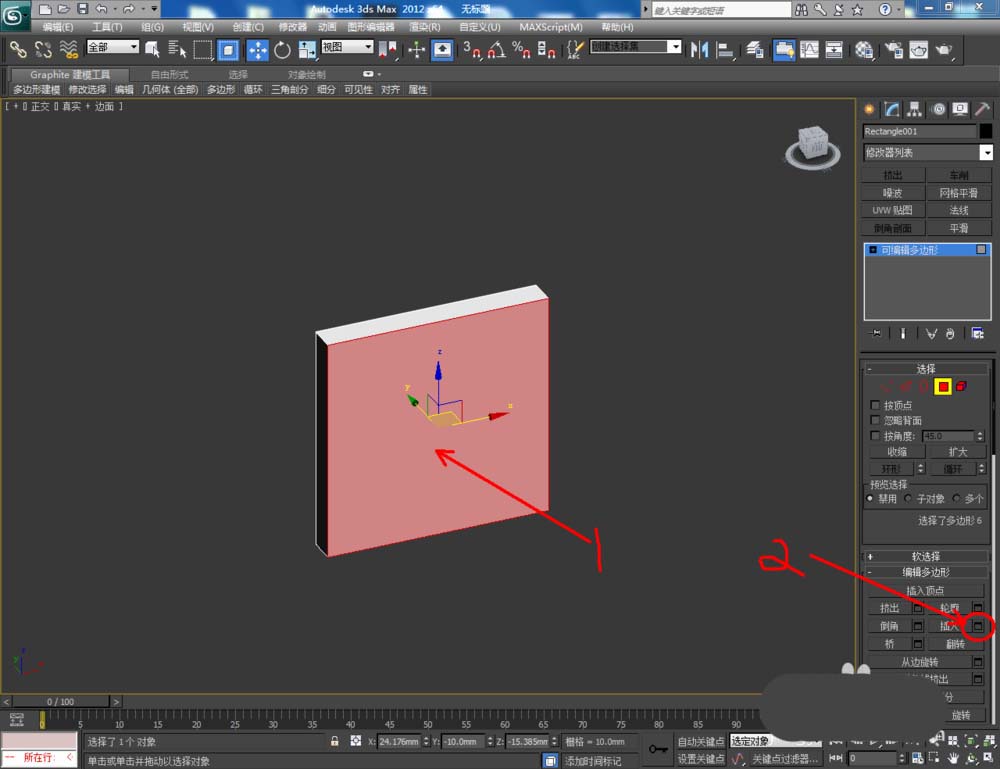3、选中模型,点击鼠标右键-【转换为】-【转换为可编辑多边形】。点击右边工作区中的【面】图标,选中模型上的面后,点击【插入】右边的小方框并设置好插入的各个参数。完成后,点击【挤出】右边的小方框,将挤出参数设置为:5mm(如图所示);