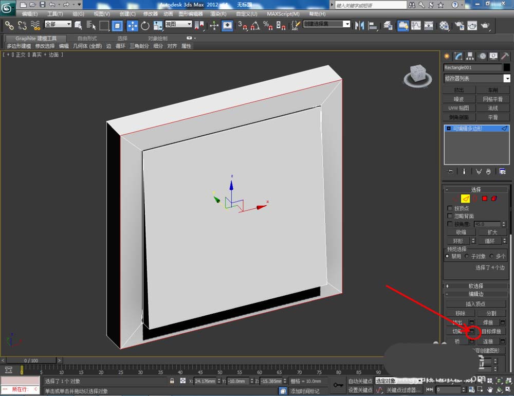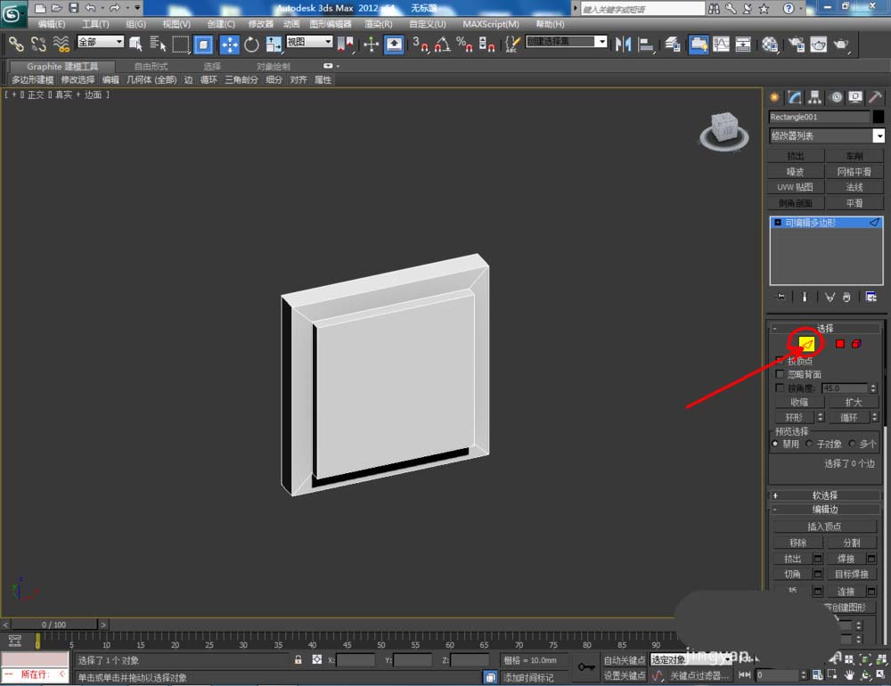 5、点击右边工作区中的【边】图标,选中开关面板周围四条边后,点击【切角】右边的小方框,按图示设置好切角的各个参数。完成后,对按钮周围的边也进行【切角】优化处理。最后,点击【渲染】将制作好的开关面板模型渲染出图即可。