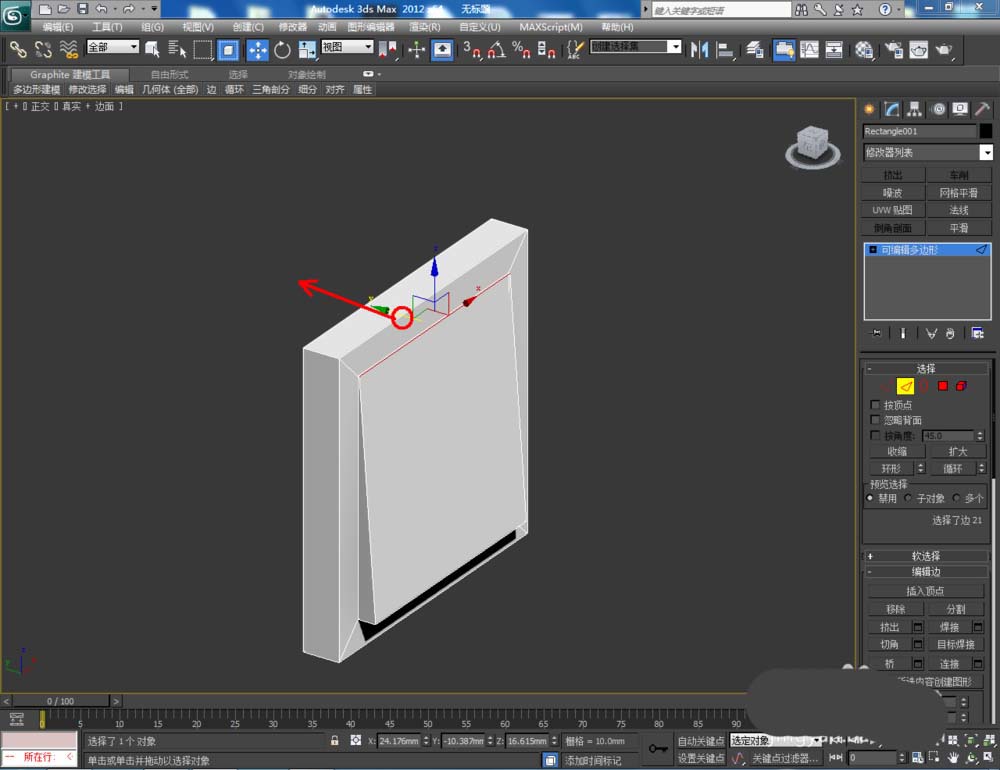 4、点击右边工作区中的【边】图标,选中开关按钮的顶边后,鼠标拉动y轴将选边往y轴方向拉动。按图示选中模型上的边,点击【挤出】旁边的小方框,将选边向内挤出,挤出参数如图所示;