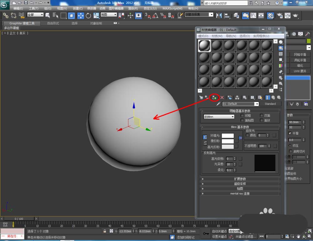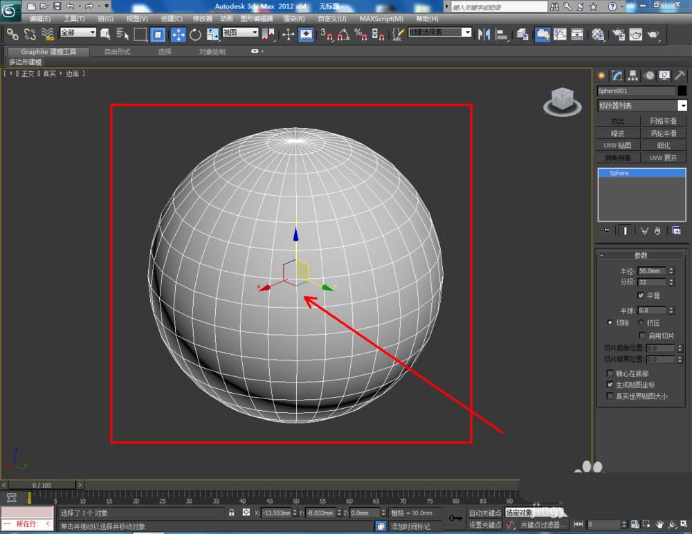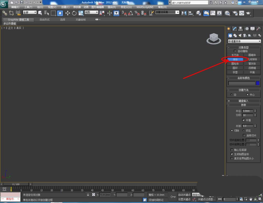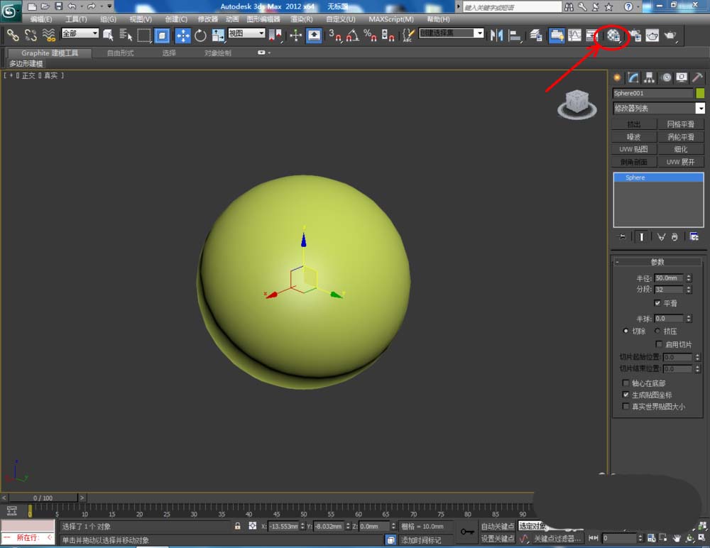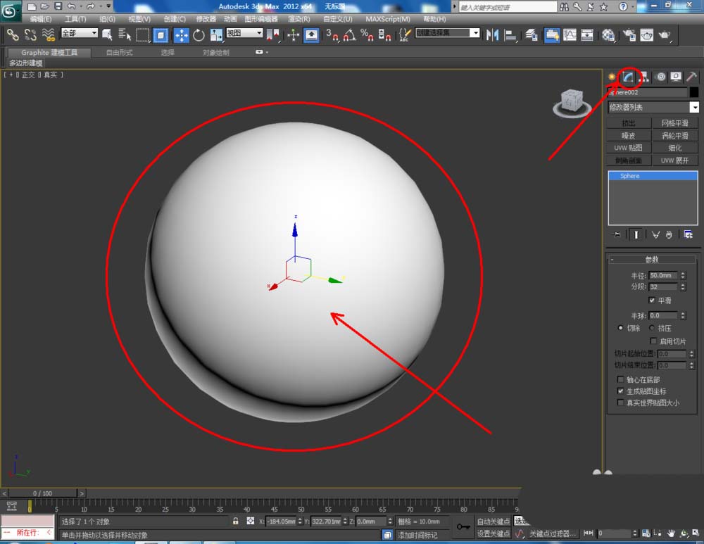 1、打开3Dmax2012软件,点击【创建】-【几何体】-【球体】,在作图区域绘制一个球体模型。点击【修改】,将球体的半径设置为:50(如图所示);