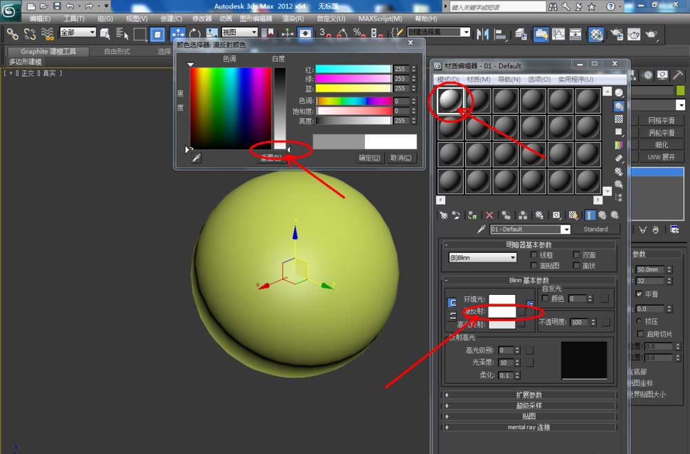 2、点击【材质编辑器】,弹出材质编辑器设置框,按图示参数设置一个白色材质球并附加给模型。选中模型,点击【对象颜色】,将模型的对象颜色设置为黑色(如图所示);