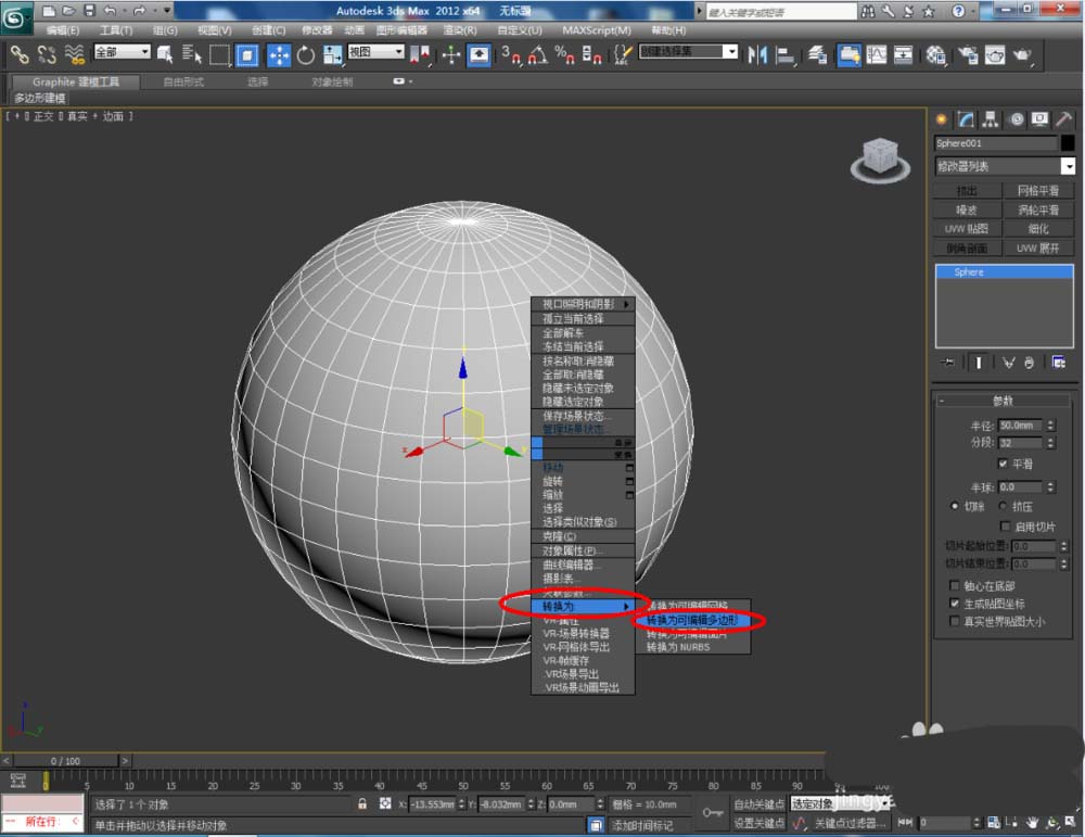 3、选中球体模型,点击鼠标右键-【转换为】-【转换为可编辑多边形】,此时的模型便转换为了可编辑多边形(注:通过点击鼠标右键可以看到,此种转换是不可修改删除的);