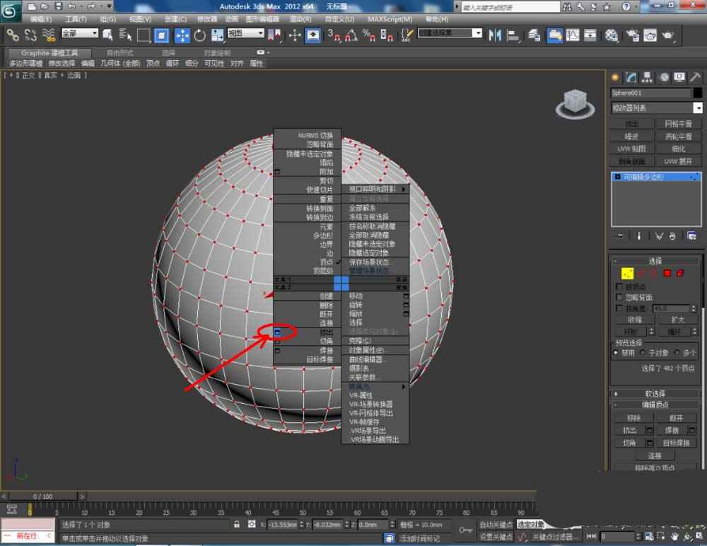 4、转换为可编辑多边形后,我们可以对模型的点线面以及元素进行编辑。以点为例,点击【点】,选中模型各个点后,点击鼠标右键-【挤出】,通过对模型点的编辑,可以制作出各种形状的模型(如图所示);