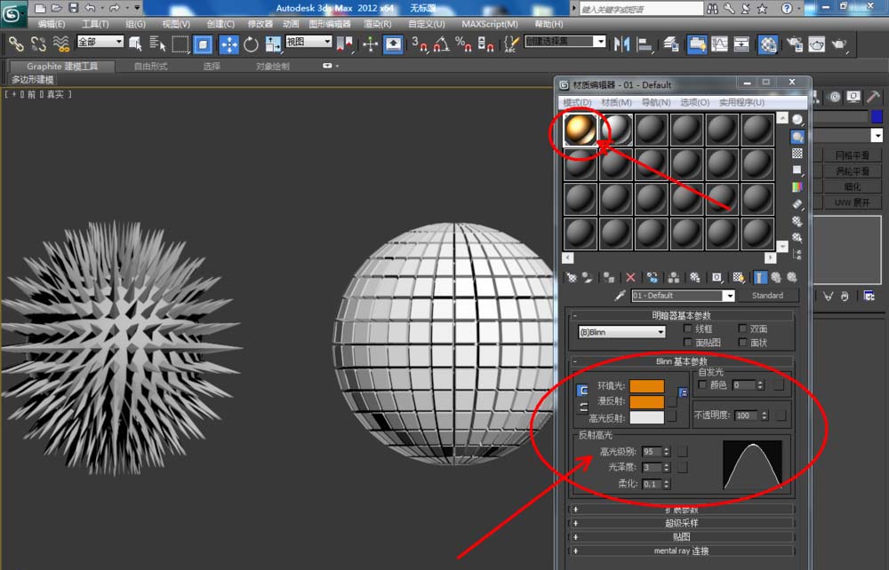 7、选中两个转换多边形编辑而来的模型,点击【材质编辑器】,设置一个金属材质球并附加给它们。点击【渲染】,将模型渲染出图即可。