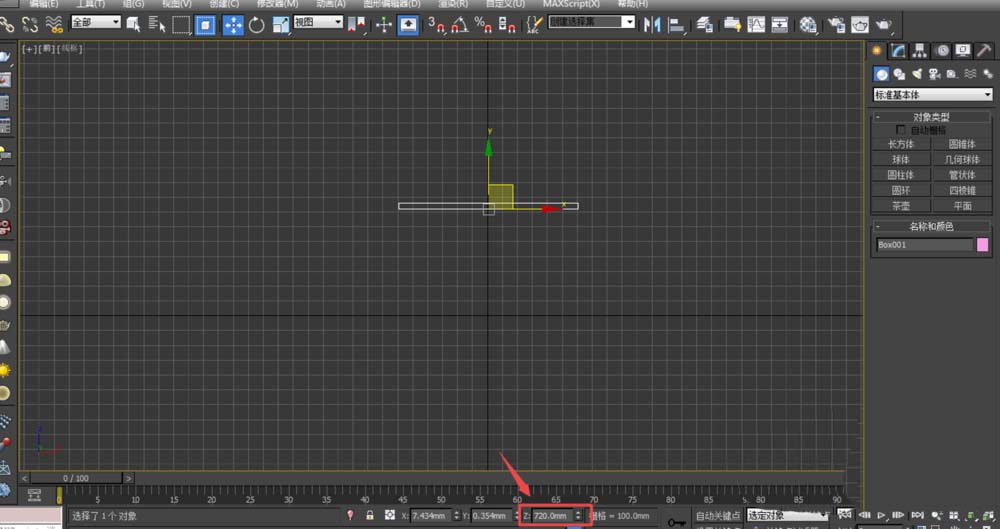 2、选中前视图窗口,按Alt+W将窗口放大,然后通过【选择】工具将长方体选中,接着将下方Z轴设置为720mm。