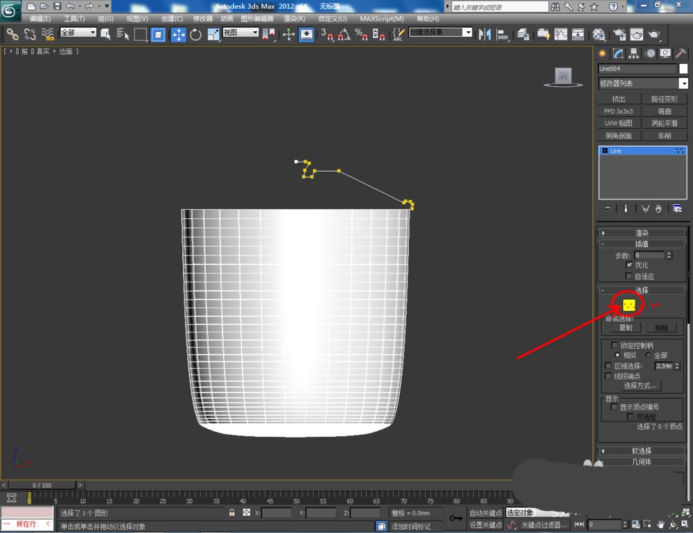 5、点击【创建】-【图形】-【线】,在作图区域绘制一个线段图案。点击【顶点】图标,选中图案上的点后进行圆化处理。完成后,选中图案,点击【车削】进行车削操作(如图所示);