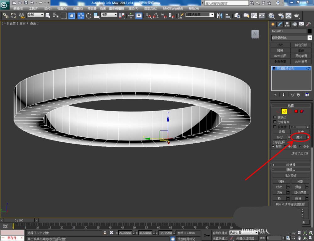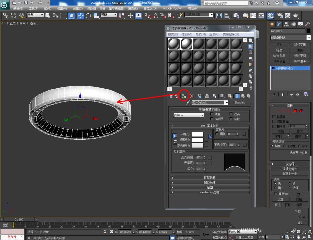 1、打开3Dmax2012软件,点击【创建】-【几何体】-【圆环】,在作图区域绘制一个圆环模型,并按图示设置好圆环的各个参数;