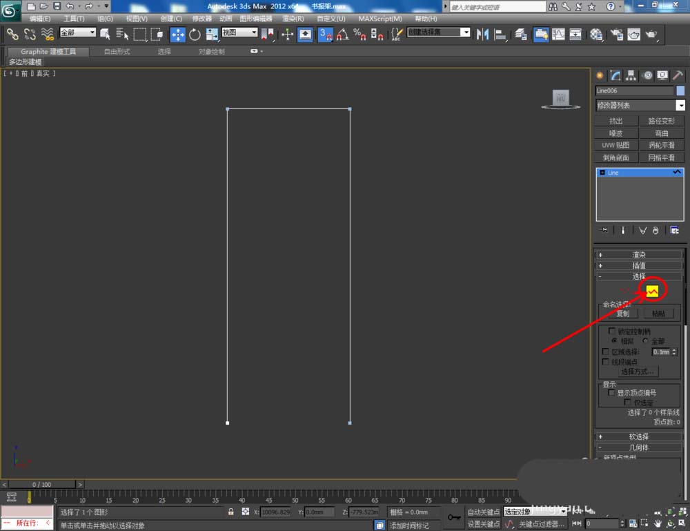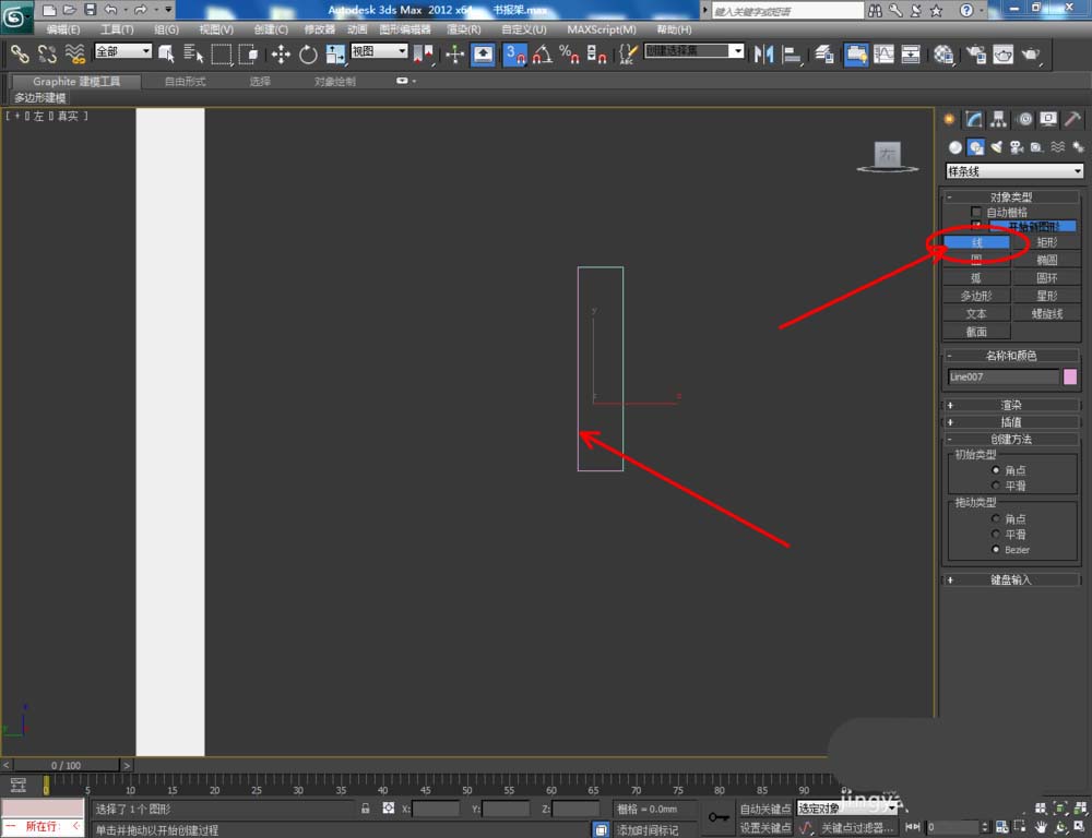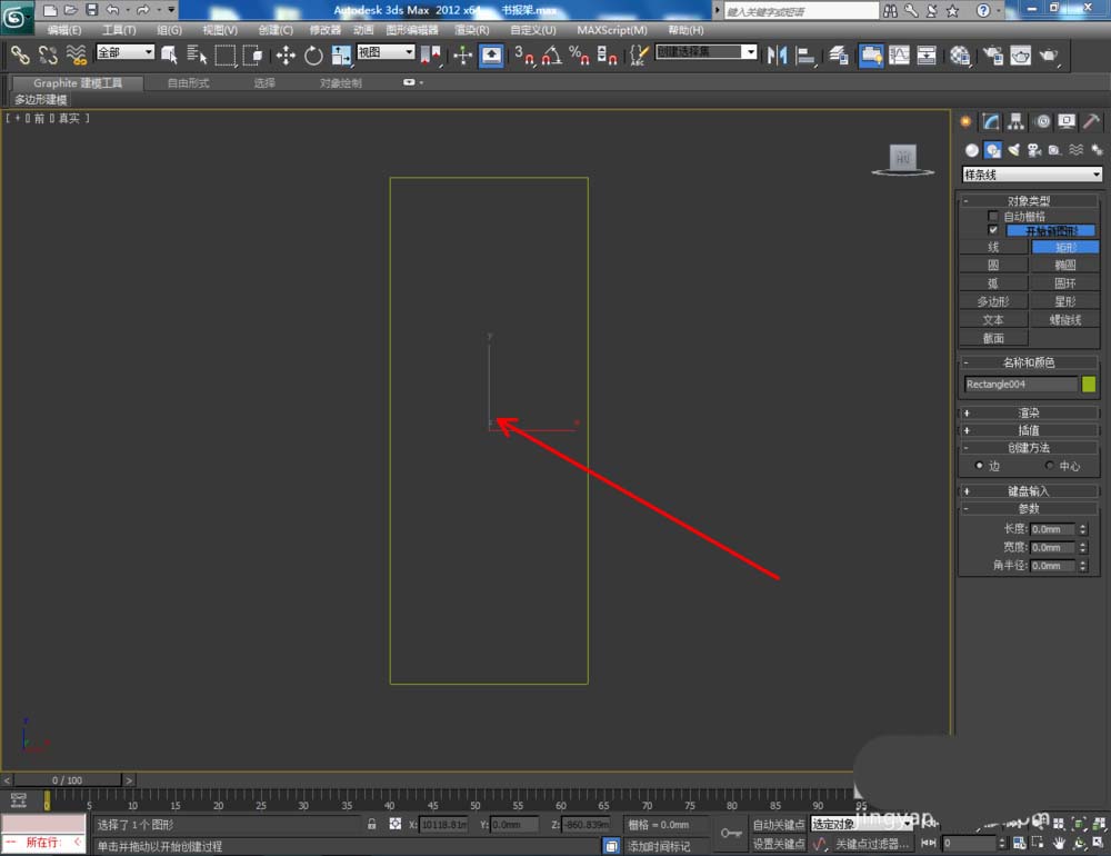 1、打开3Dmax2012软件,点击【创建】-【图形】-【矩形】,在作图区域绘制一个1280*500mm的矩形参考线图案。点击【线】,以矩形图案为参考,绘制一个线段图案并将矩形参考图案删除(如图所示);