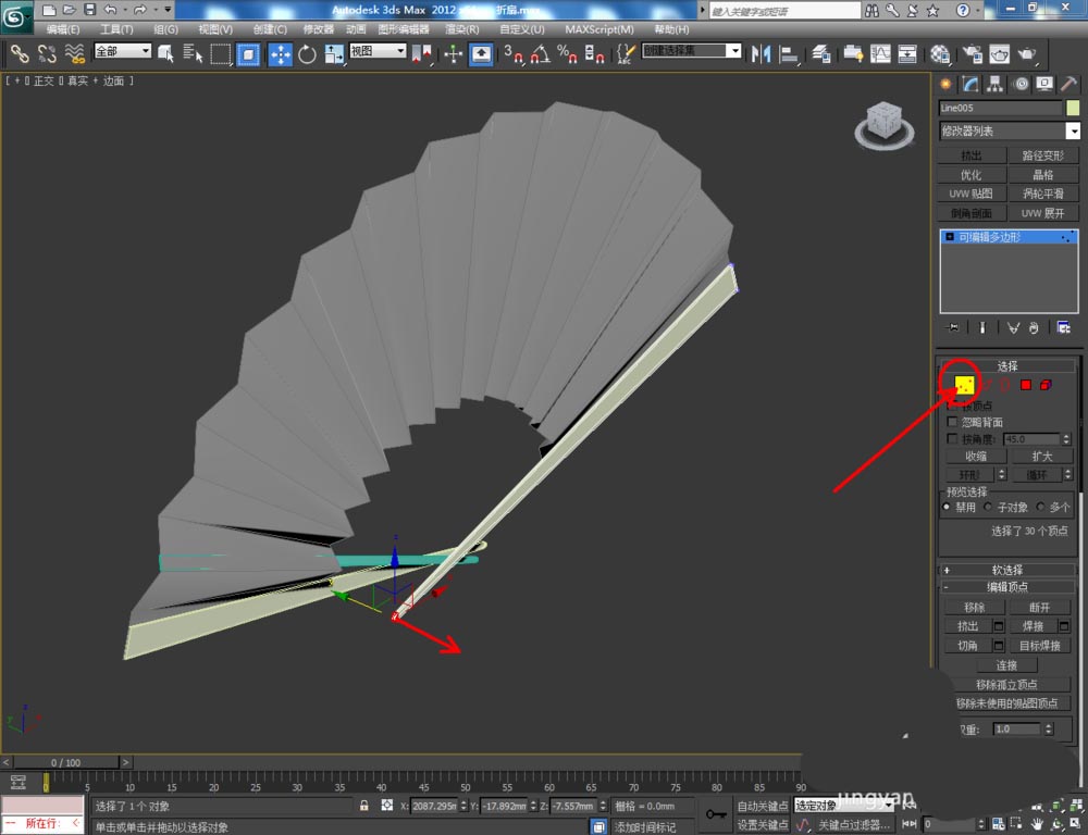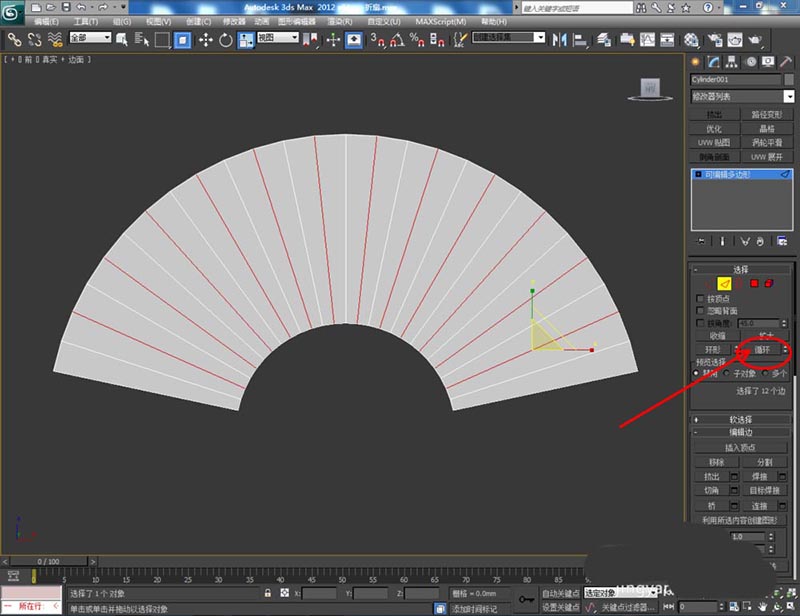 4、点击右边工作区中的【边】图标,选中图示模型上的边后,通过移动命令,对选边进行移动,制作出扇子的折痕效果(如图所示);