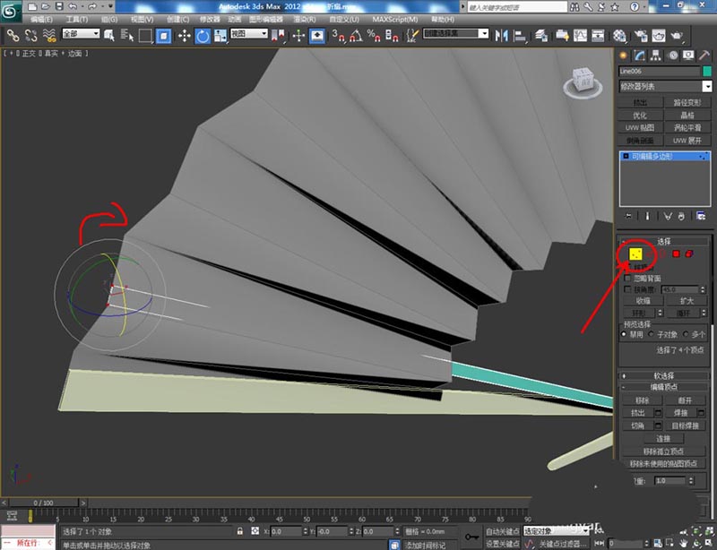 6、同样的步骤,完成中间木条模型的制作并将其转换为可编辑多边形。点击右边工作区中的【顶点】图标,按图示对木条模型上的点进行调整。按图示设置好木条的轴点位置后,以轴点为圆心对木条进行旋转复制(如图所示);