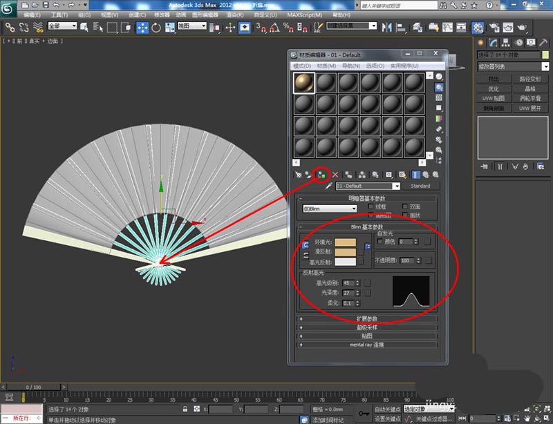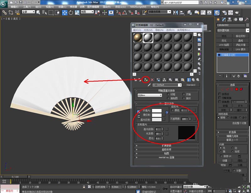 7、点击【材质编辑器】,弹出材质编辑器设置栏,按图示参数设置一个纸张材质和一个木条材质并附加给对应的模型(注:可根据需要添加图案贴图)。最后,点击【渲染】将制作好的扇子模型渲染出图即可。
