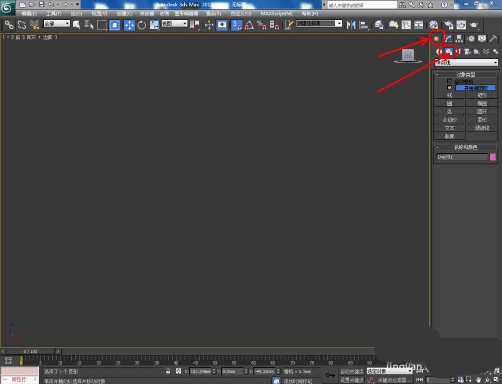 1、打开3Dmax2012软件,点击【创建】-【图形】-【线】,在作图区域绘制一个多边图案。选中图案,点击【对象颜色】将图案的对象颜色设置为:白色(如图所示);