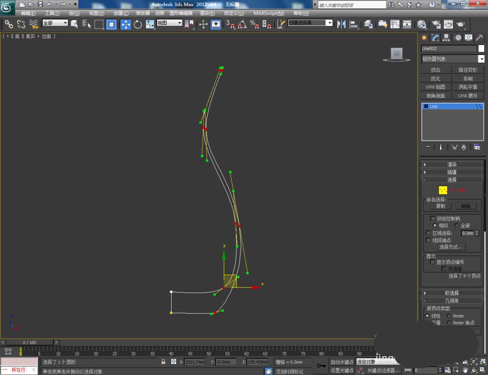 2、点击右边工作区中的【顶点】图标,按图示选中图案上的节点,将选点进行平滑圆化处理,通过调整控制点,完成花瓶截面图案的绘制(如图所示);