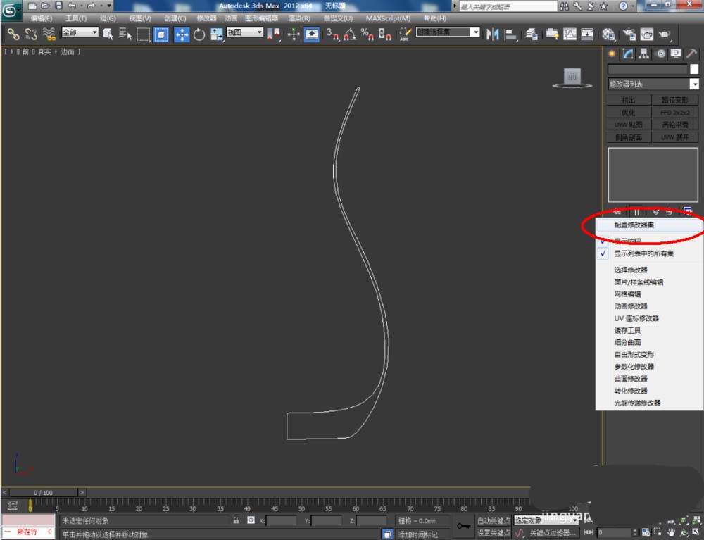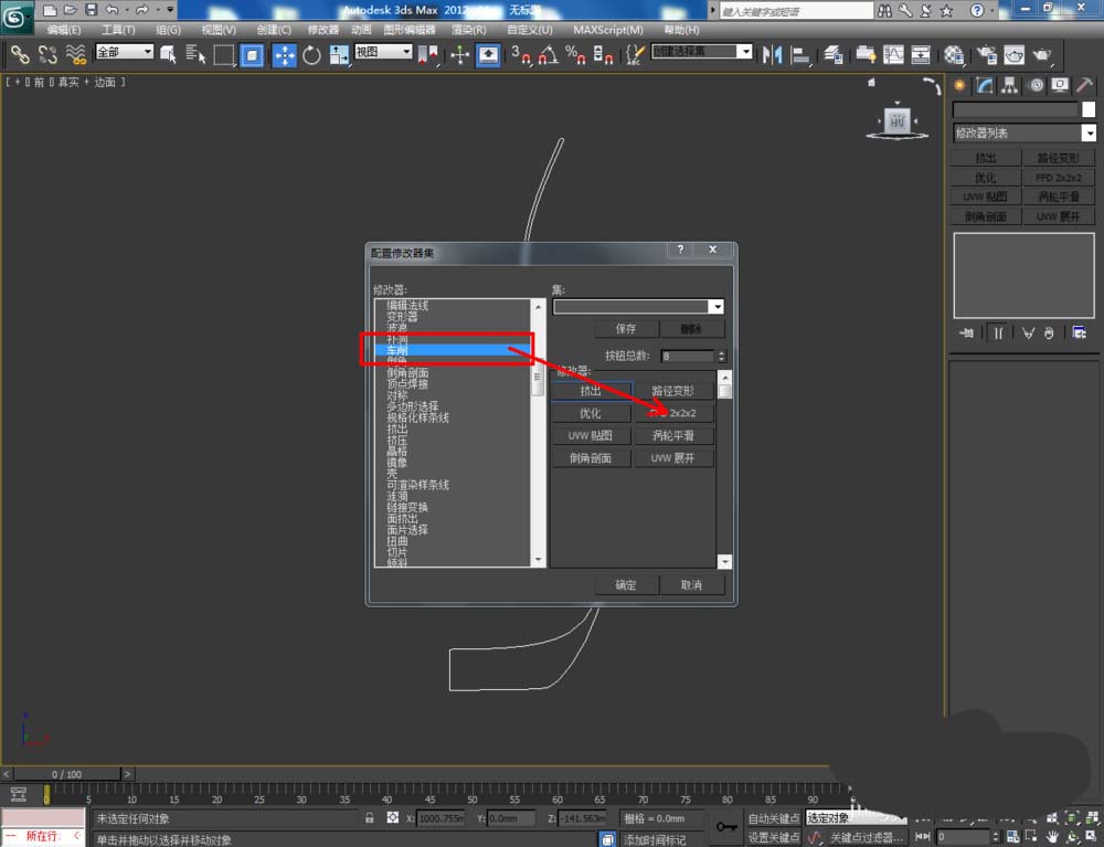 3、点击【修改】-【配置修改器集】,弹出配置修改器集设置栏,找到【车削】并将其拉动到右边选项框中,点击【确定】将车削功能调出;