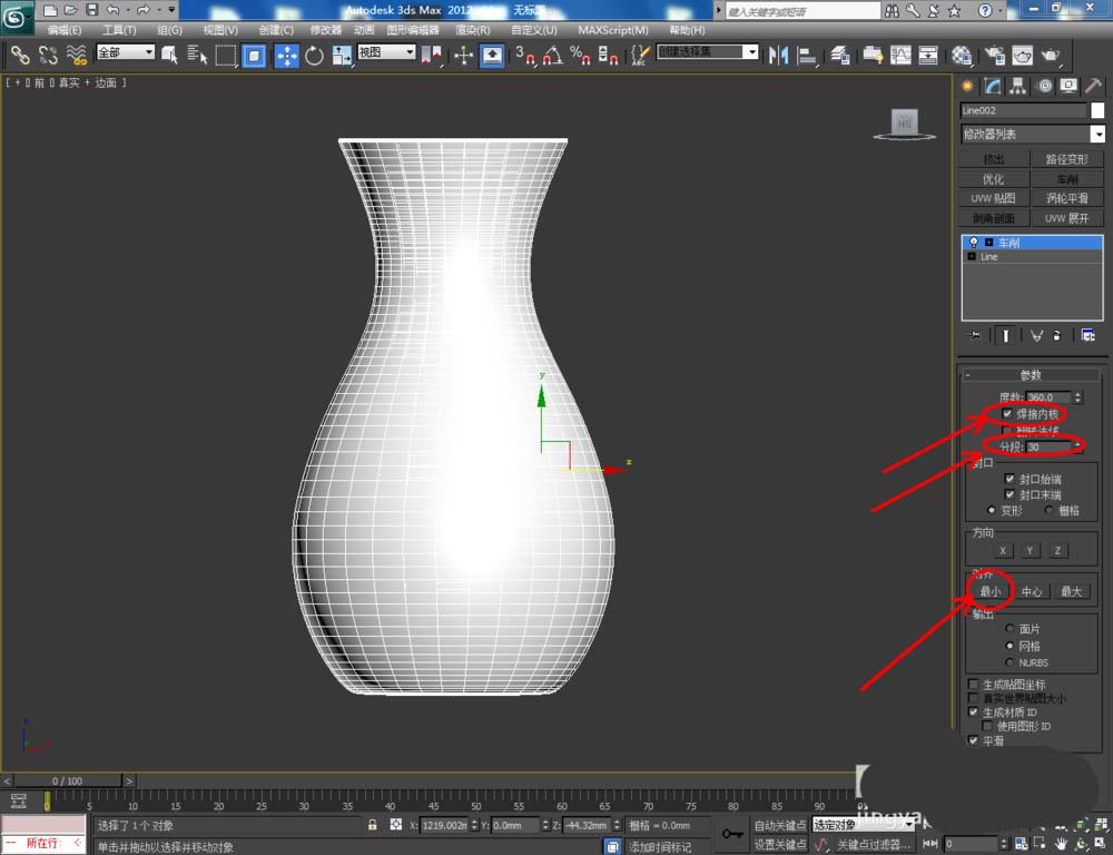 4、选中截面图案,点击【车削】后,点击【最小】并勾选【焊接内核】,将分段数设置为:30,对图案进行车削操作,完成花瓶模型的绘制(如图所示);