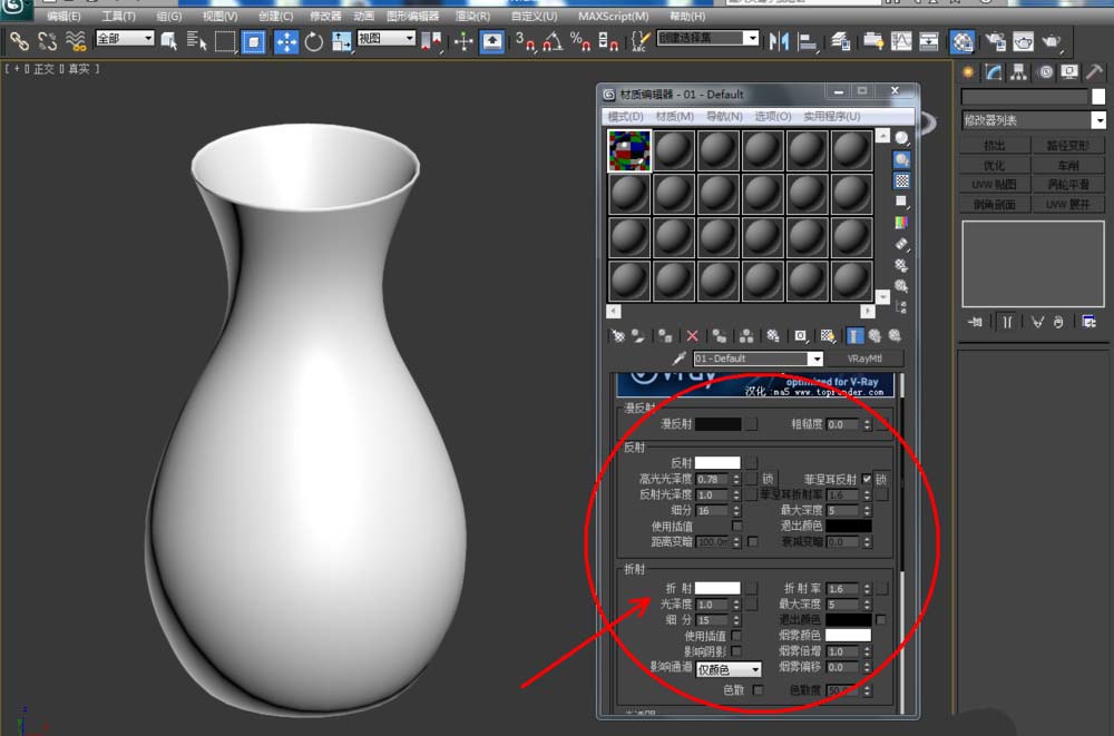6、点击【材质编辑器】,弹出材质编辑器设置栏后,按图示参数设置一个Vary玻璃材质球并附加给花瓶模型。最后,点击【渲染】将制作好的花瓶模型渲染出图即可。