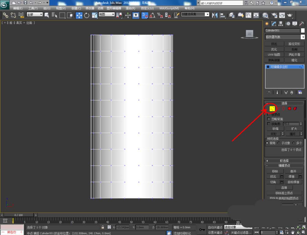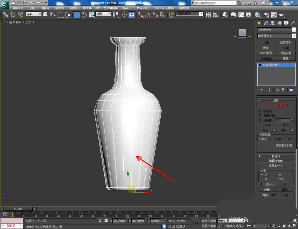4、点击【顶点】图标,利用缩放命令,对图示选点进行缩放操作。按图示通过缩放和移动命令,对模型上的顶点进行移动调整,制作出一个瓶子的模型轮廓;
