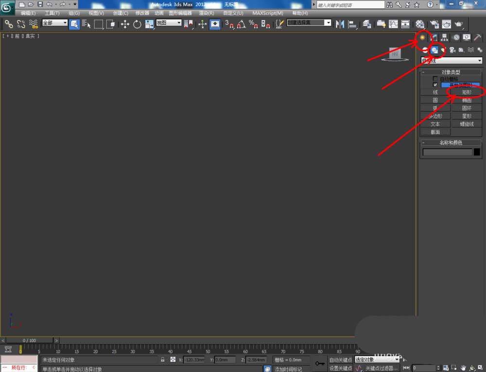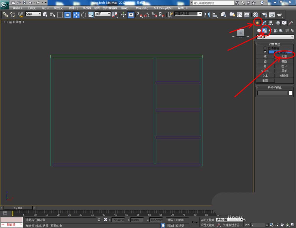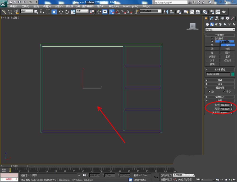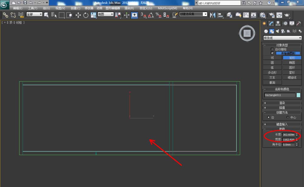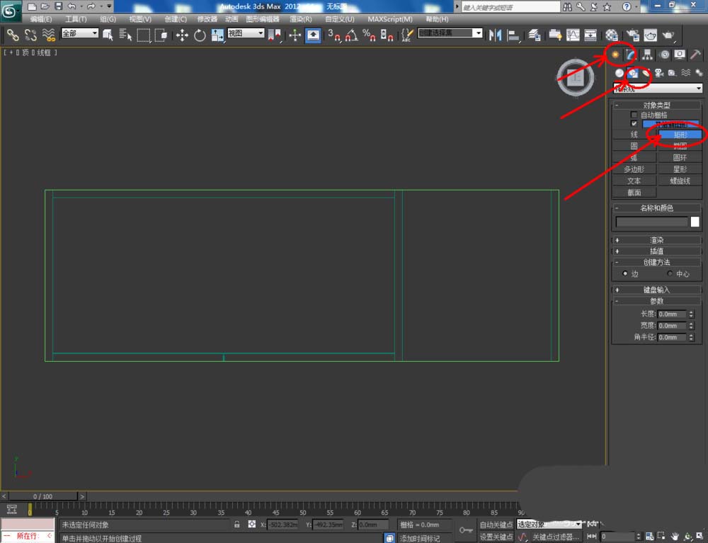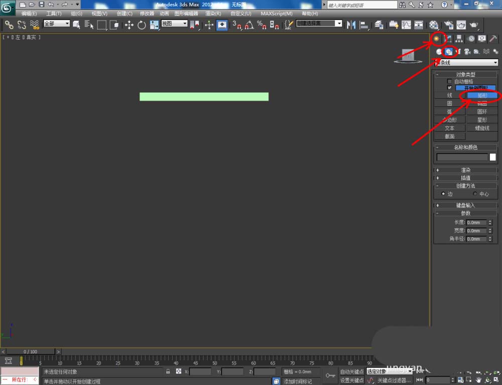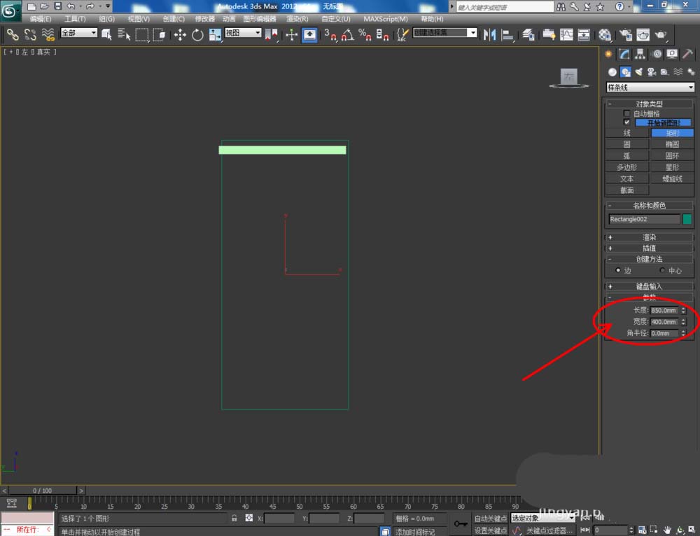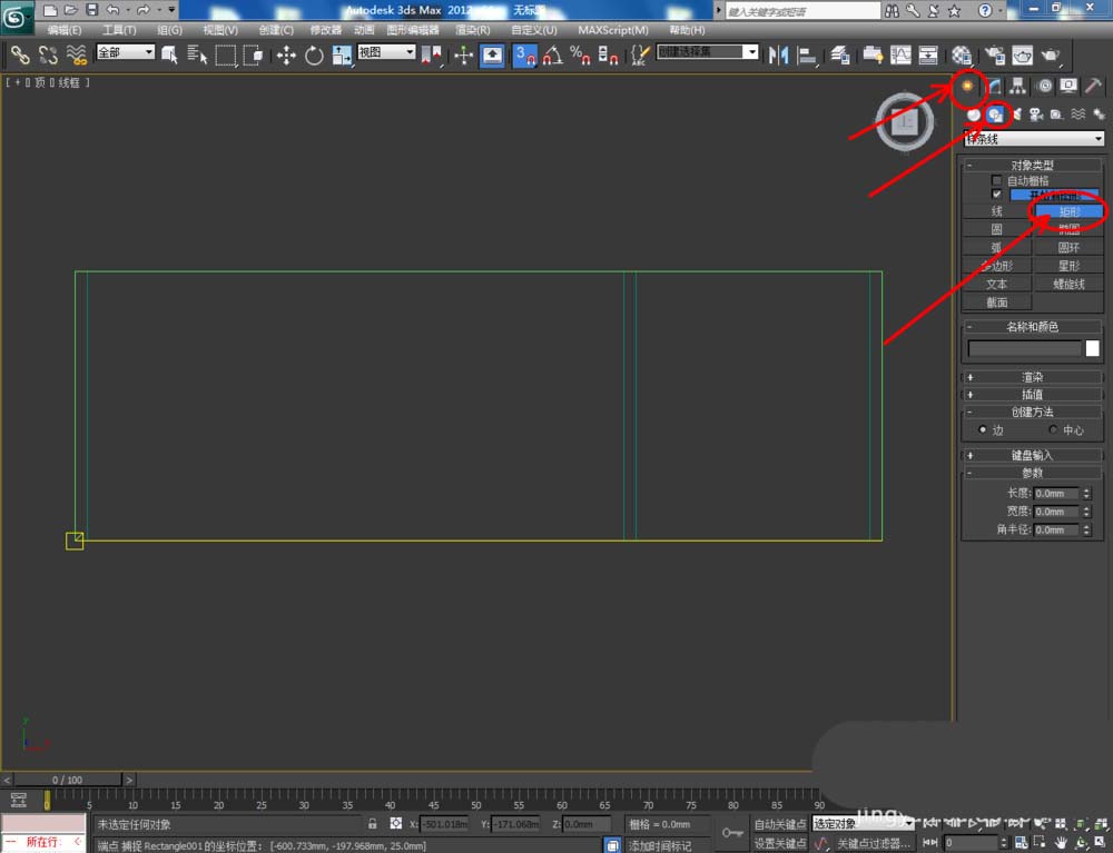 1、打开3Dmax2012软件,点击【创建】-【图形】-【矩形】,在顶视图中绘制一个矩形图案并设置好图案的各个参数。选中图案,点击【修改】-【挤出】,挤出数量设置为:25,完成鞋柜顶板模型的制作: