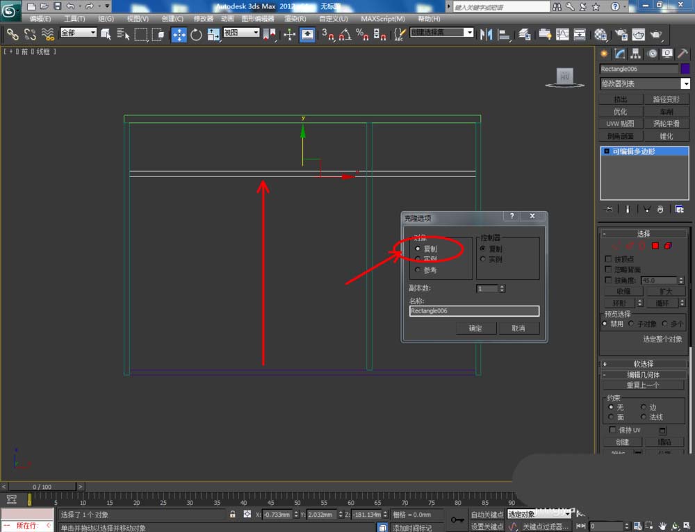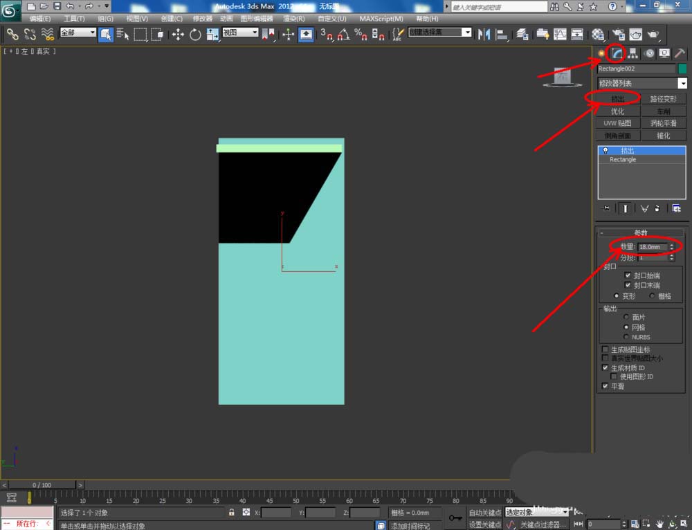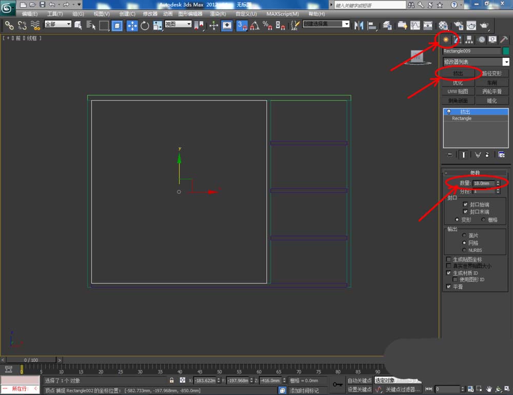 5、切换到前视图,点击【创建】-【图形】-【矩形】,在前视图中图示位置绘制出一个矩形图案并设置好图案的各个参数。选中图案,点击【修改】-【挤出】,挤出数量设置为:18,完成背板模型制作。完成后,拉动复制出一个模型副本作为鞋柜门板基本体(如图所示);