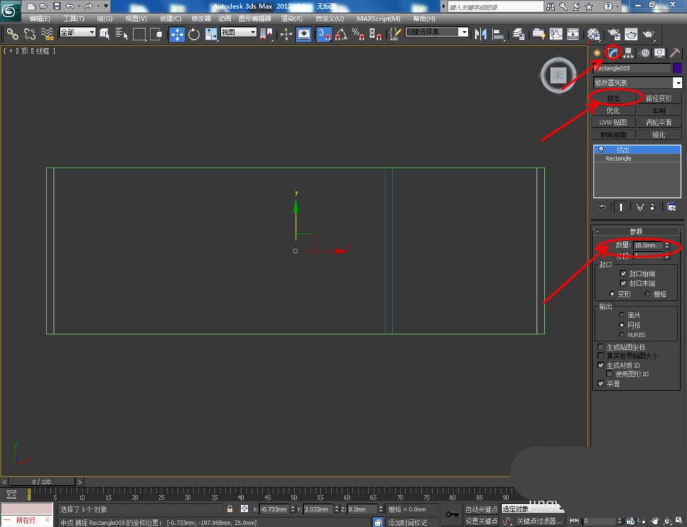 2、切换到左视图,点击【创建】-【图形】-【矩形】,在左视图中绘制出另一个矩形图案并设置好图案的各个参数。选中图案,点击【修改】-【挤出】,挤出数量设置为:18,完成鞋柜侧板模型的制作并移动复制出两个模型副本;