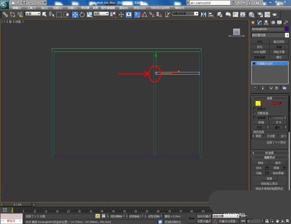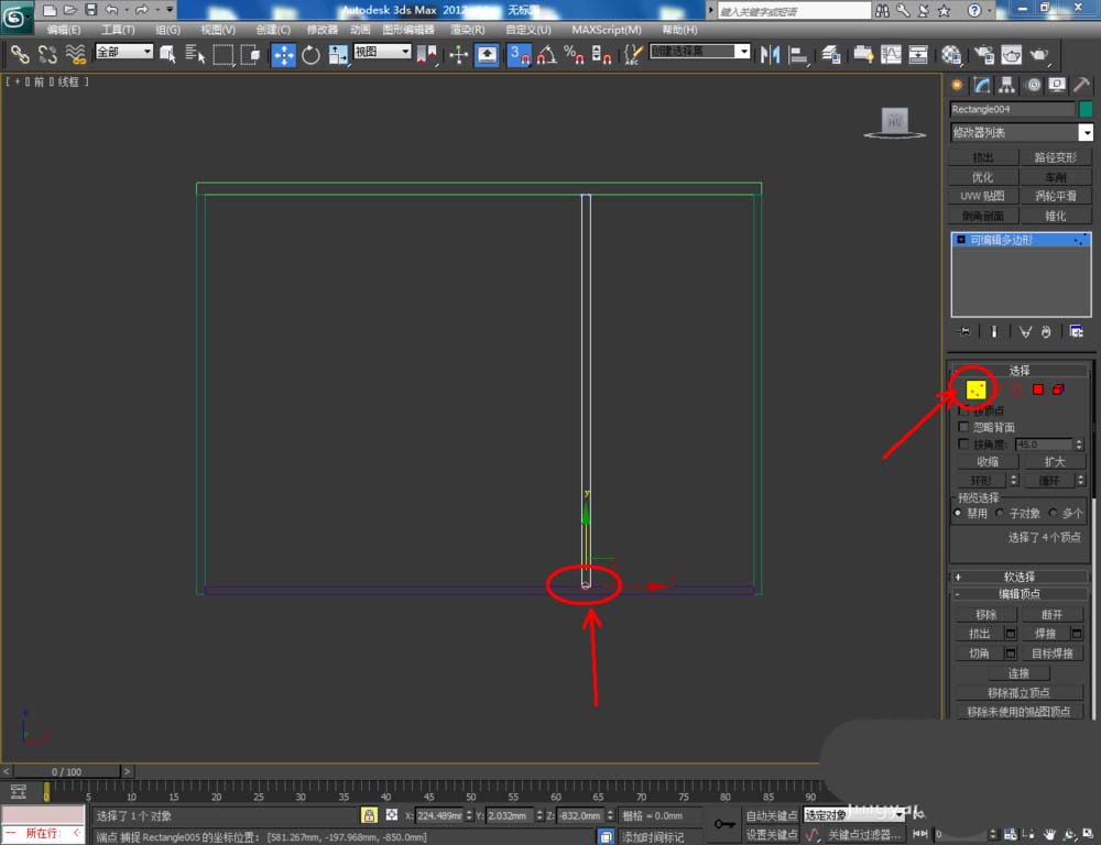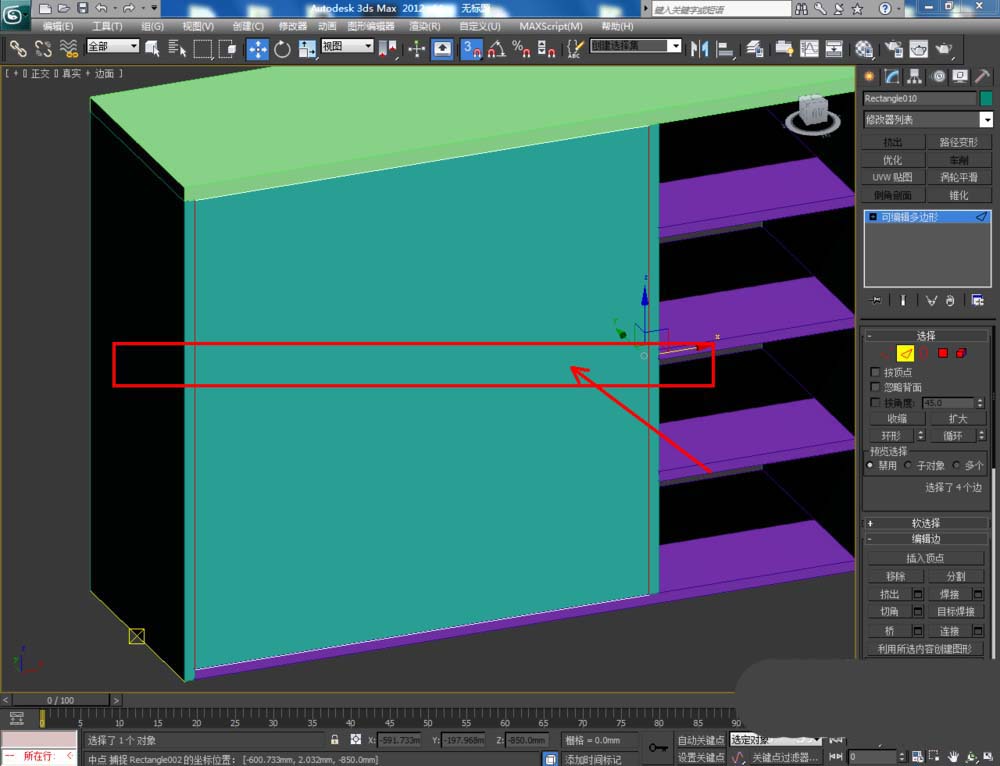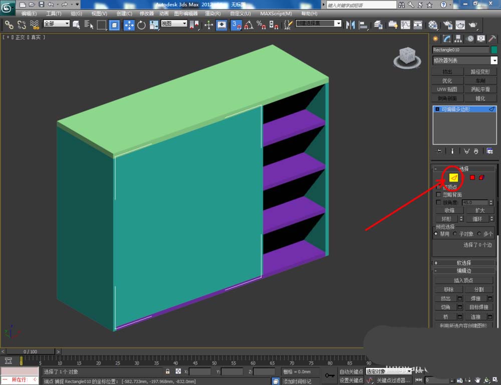4、将所有柜板转换为多边形后,选中图示柜板,点击右边工作栏中的【顶点】图标,按对图示柜板上的节点进行调整,完成鞋柜中各层板模型的制作(如图所示);