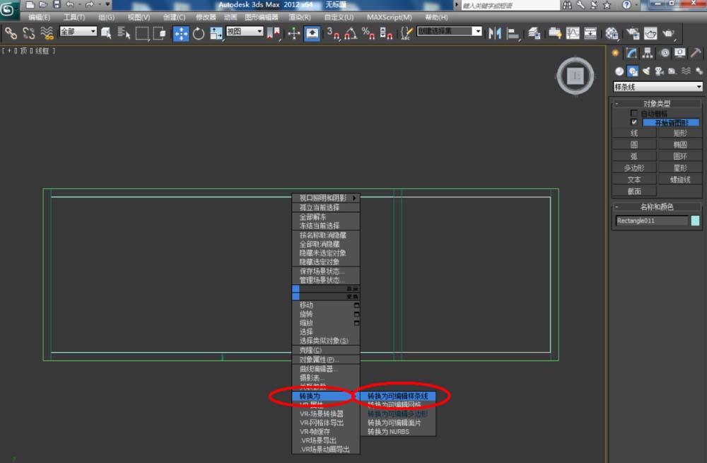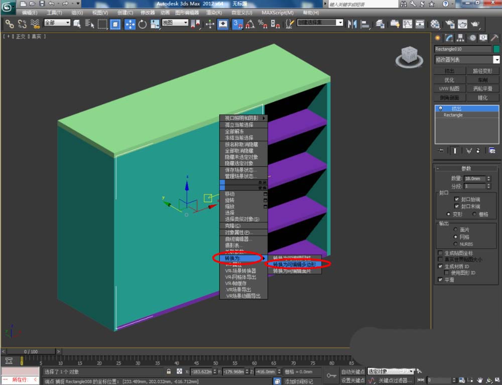 3、点击【创建】-【图形】-【矩形】,在顶视图中绘制一个矩形图案并设置好图案的各个参数。选中图案,点击【修改】-【挤出】,挤出数量设置为:18,完成鞋柜底板模型的制作。框选所有模型,点击鼠标右键-【转换为】-【转换为可编辑多边形】;