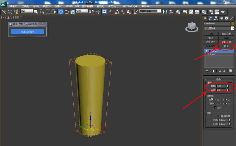8、点击【创建】-【几何体】-【圆柱体】,绘制一个圆柱体模型并按图示设置好圆柱体的各个参数。点击【修改】-【锥化】,设置好锥化参数后,将模型转换为可编辑多边形并对模型上的节点进行调整,完成柜脚模型的制作。通过移动和复制,完成其余柜脚模型的制作后,我们的鞋柜模型就全部制作完成了。
