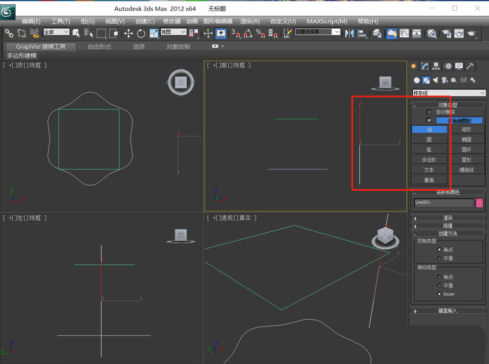 3、在前视图画一条直线作为放样路径