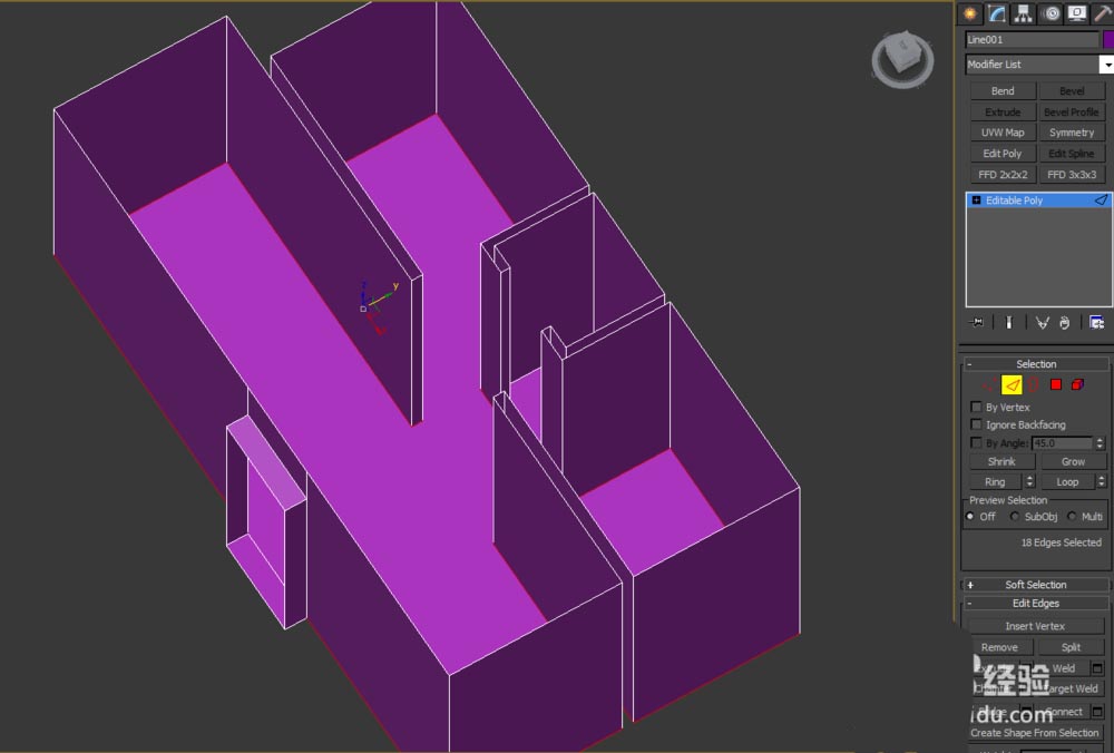 3、选择模型进入修改面板,点击边选项,选择需要制作成踢脚线的每条边;如下: