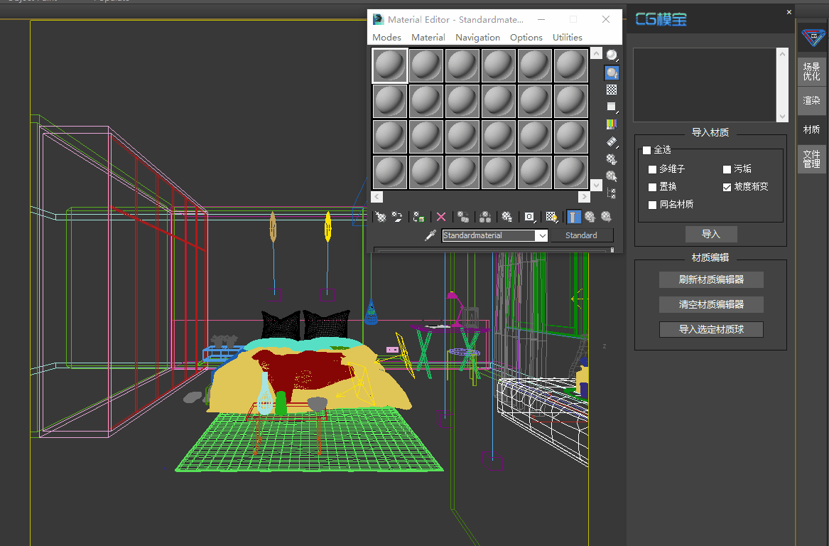 勾选多维子,垢,置换,坡度渐变,同名材质,在点击导入即可将当前场景中对应的材质贴图展示在材质编辑器面板