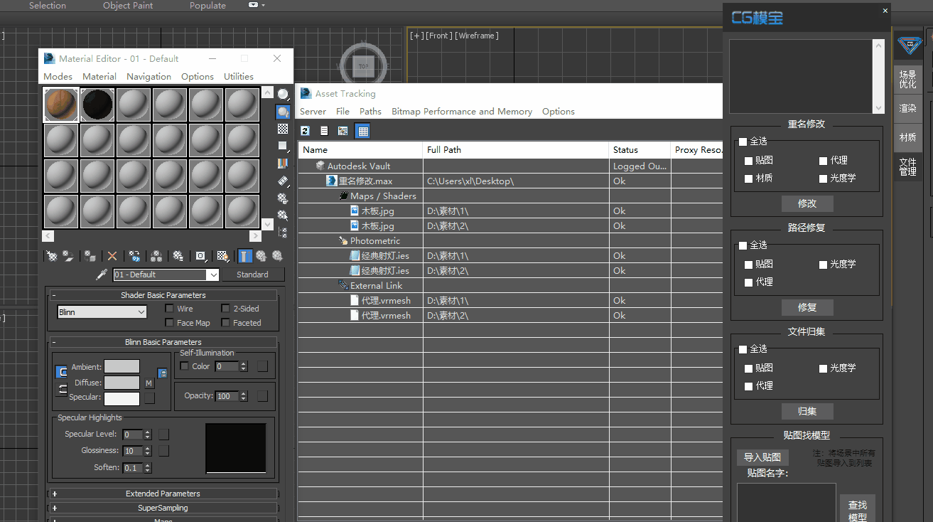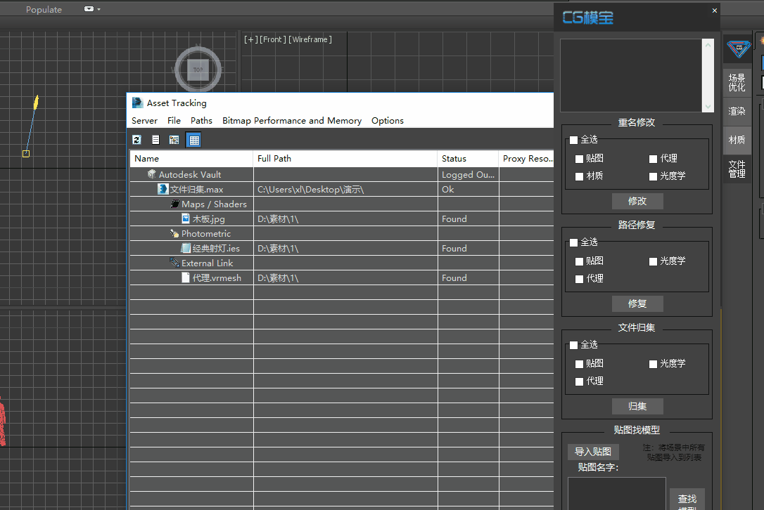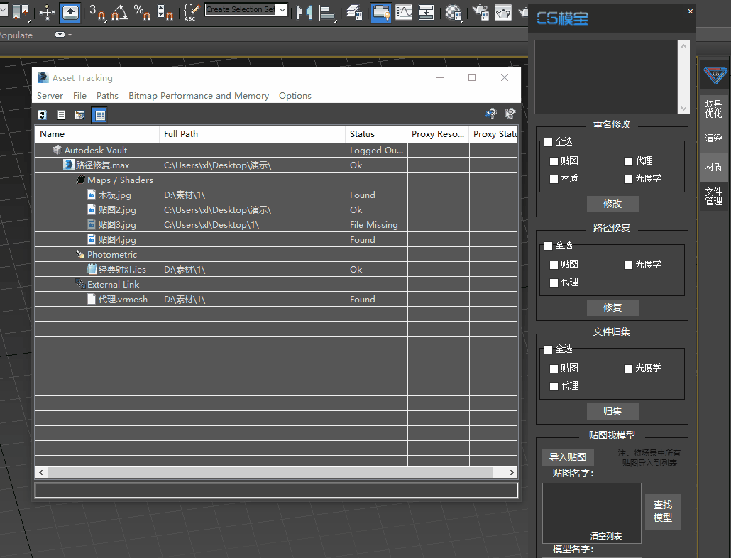 勾选贴图,代理,材质,光度学在点击修改即可对当前场景中对应的重名项进行修复