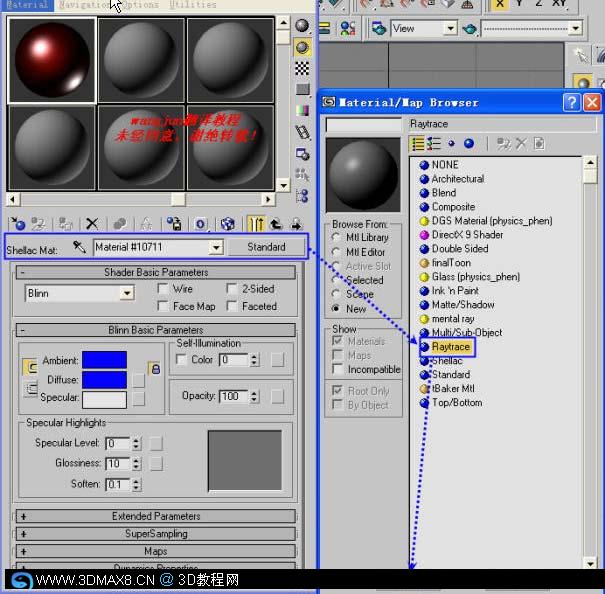 13、点击standard按钮,选择Raytrace材质类型,如图。