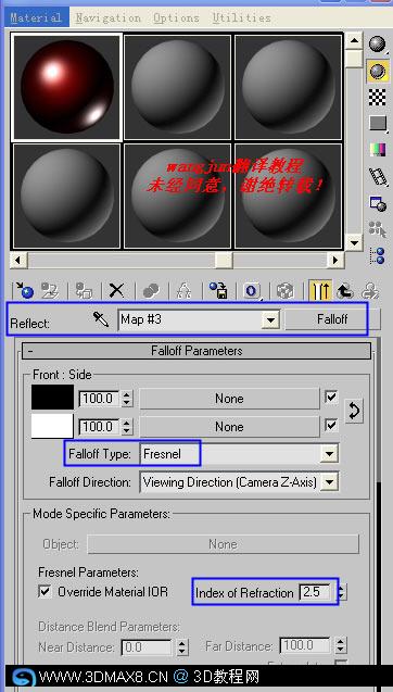 14、选择Falloff作为Reflect贴图,选择Falloff类型为Fresnel,并修改IOR为2.5,如图。