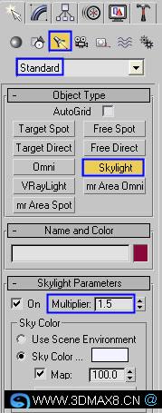 18、在场景中创建Skylight,并修改天光的倍增值为1.5,如图。