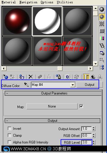 20、设置反光板的材质,在Diffuse贴图中选择Output材质类型,并设置其RGB level为3.0,如图。