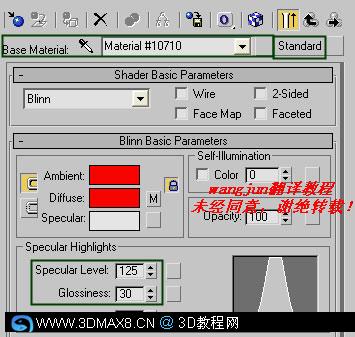 11、返回上一材质层级,设置Specular level为125,Glossiness为30,如图。