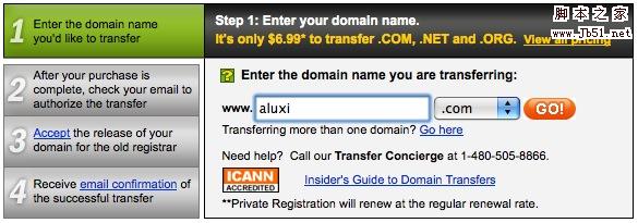 2、注册 Go Daddy 帐户,提交转移域名。如果你原来已经拥有帐户,那么登录后,选择导航菜单“Domain”下选择“Transfer Domains to Go Daddy”,输入要转移的域名,点按钮“GO”会验证域名是否被锁定,如果显示“Available For Transfer ”表示域名可以转移。选择“Checkout”,转到购物车付款。