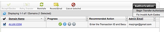 勾选你需要转移的域名,然后单击“Authorization”按钮,选择菜单中的“Begin Transfer Authorization”项。如果你没有收到 Go Dady 的转移域名确认邮件,可以点击“Resend Email ”图标,再次发送确认邮件。