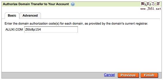 最后一步,输入域名转移密码。这个密码就是我们向域名注册商索取的密码。点“Finish”,完成域名转移操作。
