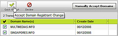 然后你会在这个过户域名列表中看到我们过户给你的域名。在勾选框选择你需要接收的域名,然后在顶部 工具栏中点击接收(Accept)按钮,域名便会开始过户到你账户中。