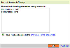 在域名转移到你账户之前,这边会出现Godaddy服务条款,而且买家必须接受然后进一步转移到你账户中。请勾选框选中条款,然后点击OK进行过户。
