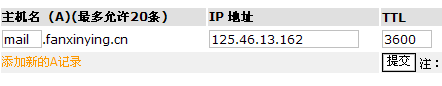 | 6、 主机名:大都输入mail 目标主机:例如输入mail.fanxinying.cn 优先级:建议填10或20 TTL(秒):默认3600就可以了,不需要设置, 然后点击新增就可以了 |