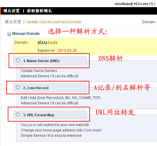 9.在设置里面,有三个选项:DNS解析/A记录解析/网址转发,它们的区别在:DNS是域名服务器(比较安全,生效时间较长),A记录(生效时间快,一般使用这个),网址转发(如其名字一样,大家可以参考演示地址)。设置方法如图9: