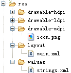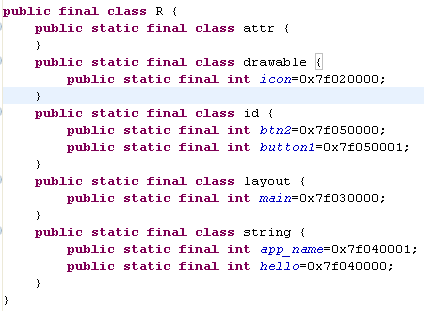 3、这些内部类中的静态字段,代表一个资源的ID,这些ID一定唯一,并且与res中指定的资源一一对应,如上图中的0x7f020000一定对应着icon.png图片资源。