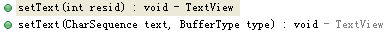 5、ID被自动写入R.java后,就能通过代码访问这些ID。但是,单纯的获取这些ID是没有任何意义的,如0x7f020000不代表任何东西,好在Android提供了通过代码获取指定ID所对应的资源的方法:通过View类的getResources()方法,可以获取一个Resources类的实例,然后通过GetXXXX(int id)方法,可以根据整形的ID,获取指定类型的资源。另外许多控件提供了赋值的2种版本,可以动态的设置值,也赋值为资源文件中的值,如下图显示了TextView控件setText的2个重载版本: