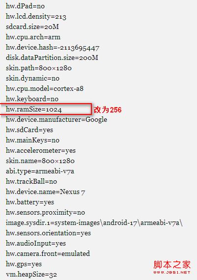 :减少分配的内存大小。修改AVD的配置文件,将选项“hw.ramSize=1024”从1024改为256。如图所示: