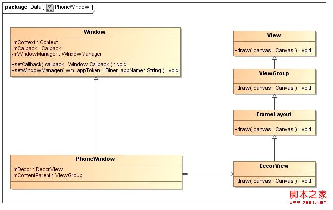 从前面Android应用程序窗口(Activity)实现框架简要介绍和学习计划一文可以知道,在PHONE平台上,与Activity组件所关联的窗口对象的实际类型为PhoneWindow,后者是从Window类继承下来的。Activity、Window和PhonwWindow三个类的关系可以参考Android应用程序窗口(Activity)实现框架简要介绍和学习计划一文中的图3和图5。为了方便接下来描述类型为PhoneWindow的应用程序窗口的创建过程,我们将这两个图拿过来,如以下的图1和图2所示: