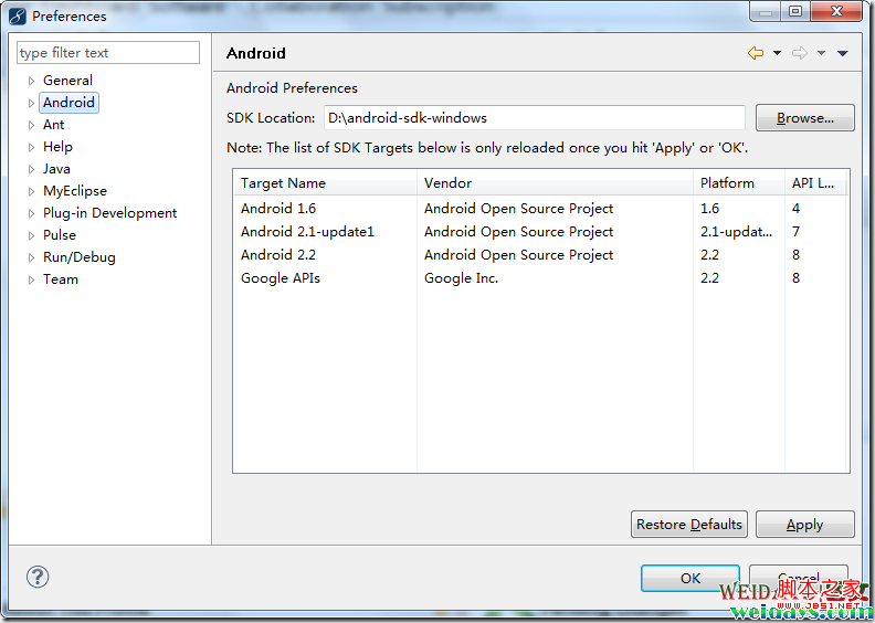 在Android选项,填写好SDK location,点击Apply后出现以下内容。