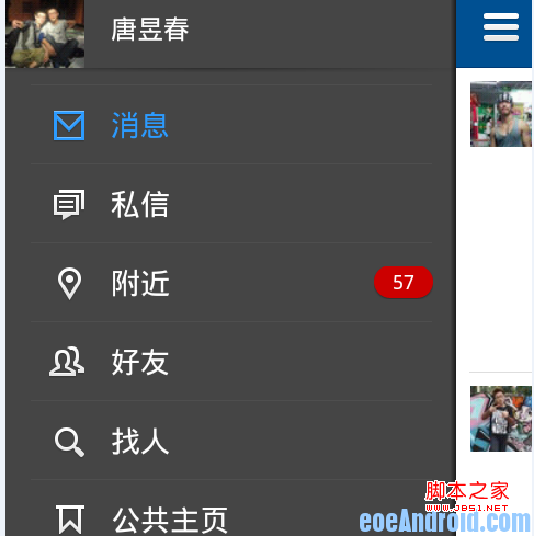 人人客户端有一个很好的导航栏,如下图所示,当点击左侧ListView后,选中的一行就会一直呈高亮状态显示,图中选中行字的颜色显示为蓝色(注意:是选中行后一直高亮,而不是只是点击时高亮),如果再次点击另外的一行, 则新的那一行就高亮,下面就来实现这个高亮效果的显示;