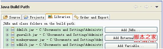 开始时,搜素到一些零碎的教程,说使用java调用monkeyrunner时,需要导入android sdk tools路径下的lib里面的4个包:ddmlib.jar,guavalib.jar,monkeyrunner.jar,sdklib.jar.当然,这里建的是java工程,往工程里面导包就是通过:右键工程》properties》Java Build Path》Libraries》add External JARs》OK。如下图: